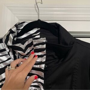 This is a super fun Berek Ladies black and silver zebra print two tone jacket. It has fun, large size bedazzling buttons, a pocket on the front and the cuffs can be worn rolled or left down. The collar of the jacket can be worn up and is adorned with the same fun buttons. The jacket is a size medium and is made of a cotton and spandex blend.