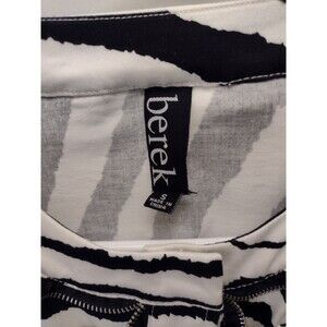 Get a little wild to your wardrobe with this new without tags Berek blazer jacket. It retails for $200. The black and white zebra print, combined with ruffle and zipper accents, makes for a bold statement piece that is perfect for any occasion. The jacket features a snap closure, long sleeves, and a short length that is ideal for layering.
