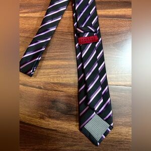 This tie features a classic diagonal stripe pattern in black and purple, crafted from a silk-like material that offers a subtle sheen. Its professional design makes it an ideal accessory for formal occasions, adding a touch of elegance to any outfit.
