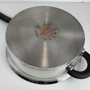 RARE The BERGHOFF 18/10 Stainless Steel Copper Clad Base 10.5"x3" Skillet with Double Handle is a versatile and high-quality kitchen essential. Made in Germany, this round skillet features a stainless steel material with a copper clad base, ensuring even heat distribution for optimal cooking results. The double handle design makes it easy to maneuver on the stovetop, while the sleek silver color adds a stylish touch to your kitchen. Compatible with electric, gas, and induction ovens, this skillet is perfect for various cooking needs and is a must-have for any home chef.