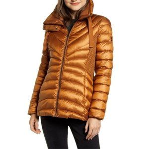 Mixed quilting and ruched side panels accentuate the shapely silhouette of a shimmery puffer insulated with lightweight synthetic fill. An inner, ribbed-knit collar helps keep chilly breezes off your neck while the polished hardware gives it a modern twist. Color: Sunset Glow (Copper/Cognac tone) Brand New With Tags. New with tag, but has a small imperfection on the front, since my little son touched it with his little hands and had a little bit of food grease on his hands.