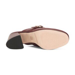 strap and buckle accent, angled block heel, leather lining