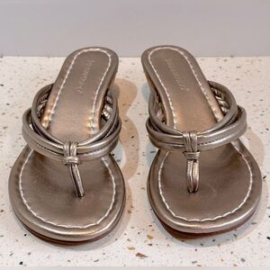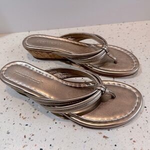 BERNARDO Miami Leather Platinum Metallic Tong Cork Wedge Sandals