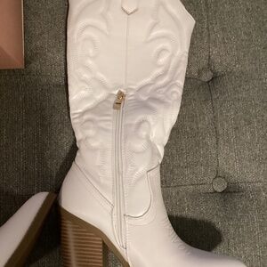 Intricate stitching creates a Western-inspired look to this faux leather cowboy boot for a retro style.