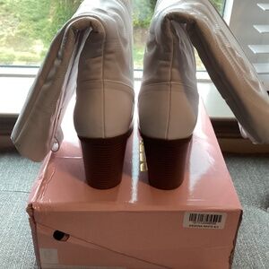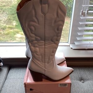 Intricate stitching creates a Western-inspired look to this faux leather cowboy boot for a retro style.