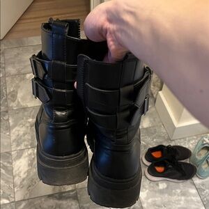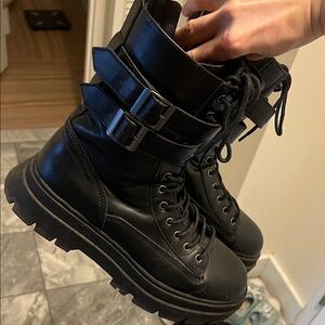 Stylish black combat boots featuring buckle straps and lace-up design. Perfect for a bold look.
