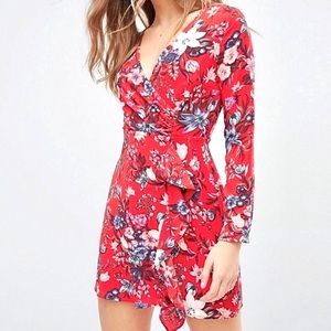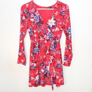 BERSHKA Red Floral Print Wrap Long Sleeve Mini Dress - Size Small