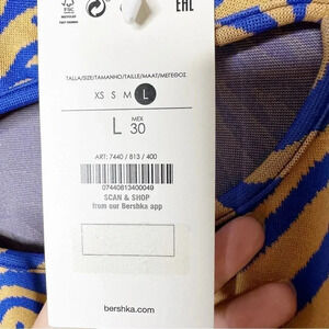BERSHKA Zebra Blue Tan Short Sleeve Crop Top Front Slit Size Large