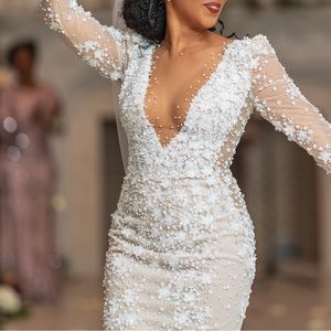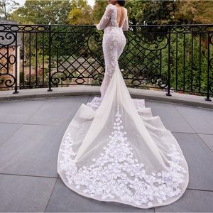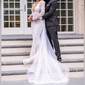 This stunning, show-stopping gown from the Berta Colony collection made my wedding unforgettable! The gown is truly breathtaking and I received countless compliments on its unique style on the wedding day and after. The long sleeves, deep V-neck plunge, and detailed floating pearls and satin flower embroidery make it one-of-a-kind. I tried on over 100 dresses and nothing was even close to this classy yet sexy style. Photographs and videos beautifully in both day and night (check video).