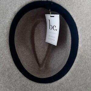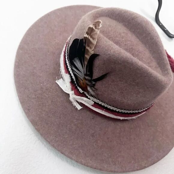 Adorable artisan made fedora, made especially for BESPOKE CLOTHING! One size fits most. Hat is a medium tan and is a wool blend. Dark burnt orange and cream details with feathers.