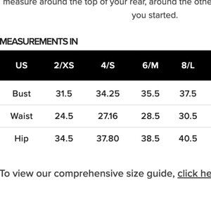 US: Model is 5’9” and wears a size 4. Bust: 32 and 1/2" Waist: 25” Hip 36”