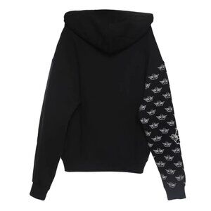 This black sweatshirt features a bold design with one plain sleeve and the other with a striking white cherub pattern, creating an edgy, asymmetrical look.