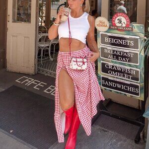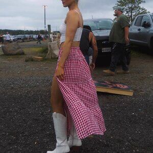 BEST EDIKTED Plaid Side Slit Tiered Maxi Skirt Red/White Checks