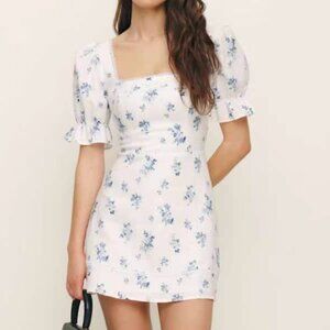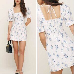 BEST Reformation Evianna Linen Mini Dress Sz2 Delicacy Blue Ivory Floral Causal