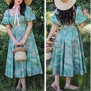 BEST Selkie The Water Lilies Day Midi Dress XSmall Green Cotton Party Cocktail