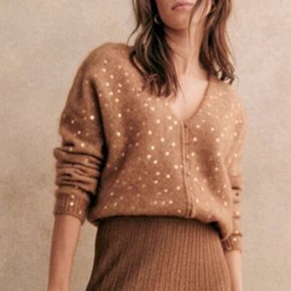 BEST Sezane Lizy Cardigan Camel Gold Polka Dot French Wool Causal
