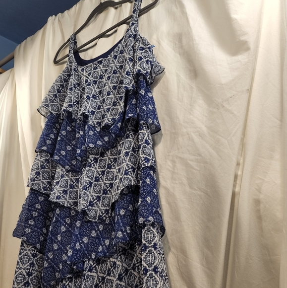 Bethany Blue and white multi tiered abstract dress. Slightly asymmetric hemline. Fully lined.