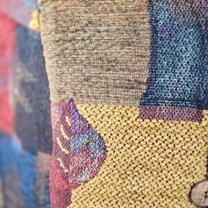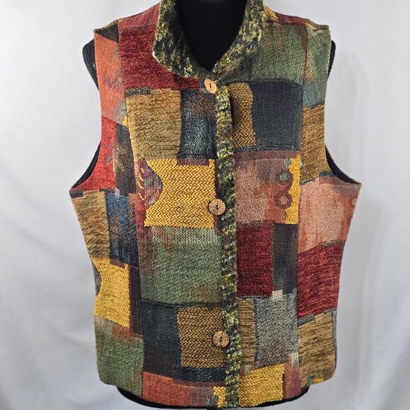 This unique vest by BETS by Canvasbacks features a patchwork design with wood buttons. The multicolor vest is made of a combination of polyester, nylon, cotton, wool, and acrylic materials and is 100% acetate lined for added comfort. It is available in size XL and is suitable for women who prefer a regular size type. The sleeveless vest has a stylish look and is perfect for layering over a shirt or blouse. It is made in the United States and has wood button accents that add to its overall design. This vest is a great addition to any wardrobe and is perfect for those who love to experiment with different styles. Very good pre-loved condition. Please review pictures for measurements.