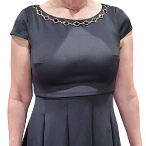 Color/Pattern: Solid black dress with gold chain neck with black beveled gemtones and rhinestone accents
