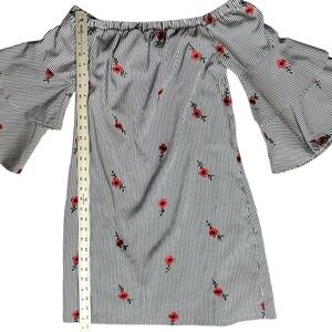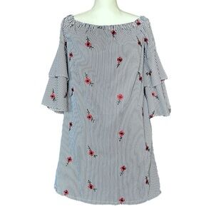 BETSEY JOHNSON Blue & White Stripe Embroidered Red Flowers Short Shift Dress 6