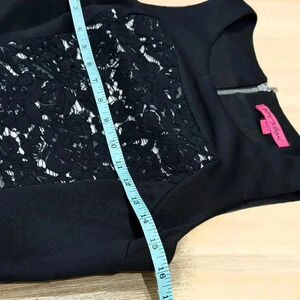 This Betsey Johnson cocktail dress is the perfect addition to your wardrobe. The dress features a round neckline, sleeveless design, and knee-length hemline. It is made of spandex and rayon lace fabric with a solid pattern and accented with lace.