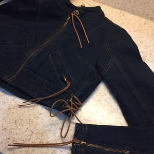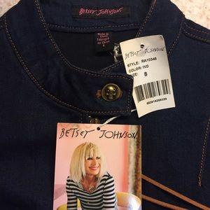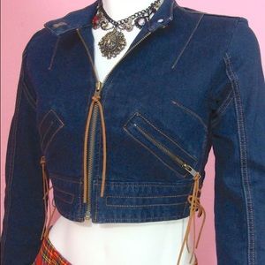 Brand new with tags vintage Betsey Johnson cropped dark blue denim skull jean jacket with brown suede corset ties at sides. Skull brass button detail at neck line. ☠️ Brass zipper closure and 2 small zippered side pockets that would fit a credit card/lip stick inside. This is a size 8 but fits more snug like a size 6 and is made of a stretchy jean material. Length of jacket falls at natural waistline. Measurements of jacket lying flat: 16" waist, 17" breast, 16" shoulder-shoulder.
