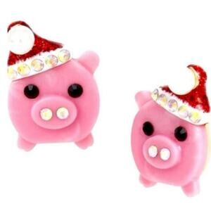 Charming stud earrings featuring cute pigs wearing Santa hats accented with imitation pearls and pave glass.