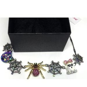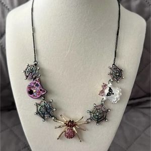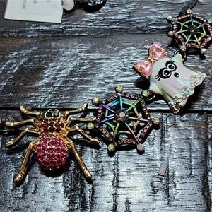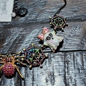 BETSEY JOHNSON HALLOWEEN SPIDER CAT GHOST & WEB PENDANT NECKLACE WITH CRYSTALS