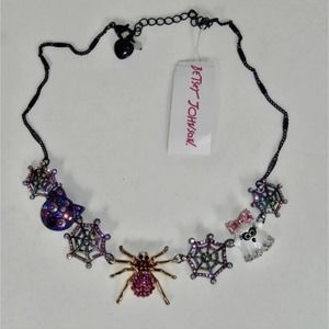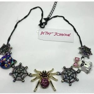 Get into the Halloween spirit with this charming pendant necklace from Betsey Johnson. Featuring a colorful array of spider, ghost, cat, and web charms, this gold-tone necklace is perfect for any Halloween occasion. The round link chain measures 18 inches with a 3-inch extension, and the lobster closure ensures a secure fit.