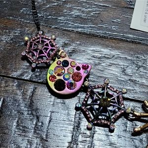 Crafted from mixed metals and stones, this necklace boasts multiple rhinestones and crystals in a round shape. The pendant/locket type is a charm, and the style is a pendant. This necklace is perfect for Halloween enthusiasts and is sure to add a touch of spookiness to any outfit.