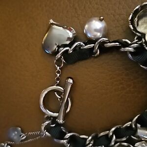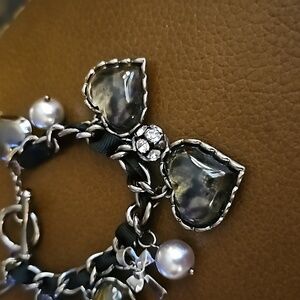BETSEY JOHNSON Heart Pearl Peace Sign Woven Ribbon Chain Charm Bracelet