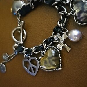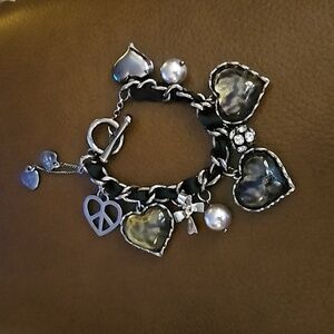 Introducing the Betsey Johnson Heart Pearl Peace Sign Woven Ribbon Chain Charm Bracelet: a whimsical blend of hearts, faux pearls, and peace sign charms. This vibrant accessory features a mix of metal chains and woven ribbon, creating a playful, layered look that's perfect for adding a unique touch to any outfit.