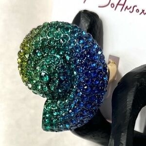 💙From Betsey’s Summer 2025 Mermaid Jewels collection; Oversized spiral conch/snail shell design stretch ring covered in an ombré pattern of crystals blues, greens, and yellows