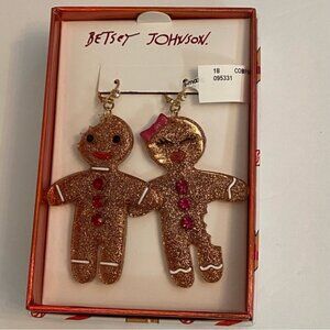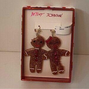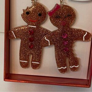 BETSEY JOHNSON NEW EARRINGS GINGERBREAD MAN & LADY BITE BROWN LUCITE DANGLE NIB