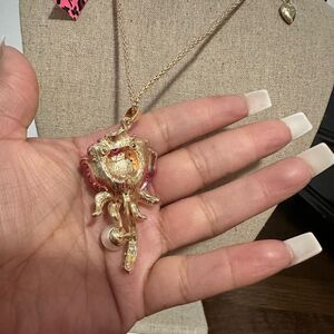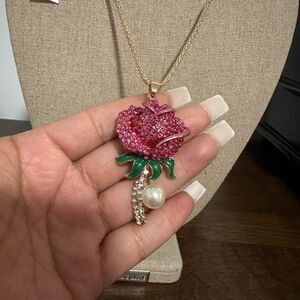 🆕 BETSEY JOHNSON PINK ROSE CRYSTAL PEARL & ENAMEL PENDANT CHAIN NECKLACE