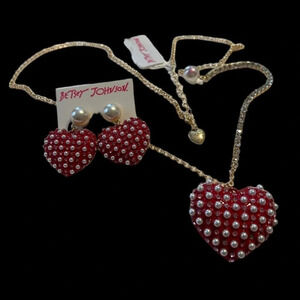 BETSEY JOHNSON SET Valentine Pearl & Crystals Heart Earrings & Necklace NEW NWT