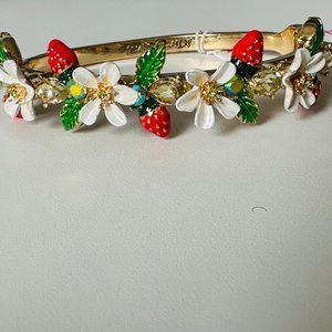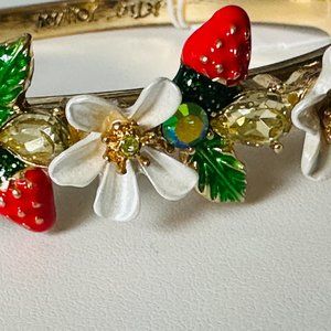 Hinged bangle bracelet featuring delicious red strawberries, white flowers, green leaves, stones, and gold-tone hardware details. The bracelet is set in gold-tone metal with an easy-hinged closure.