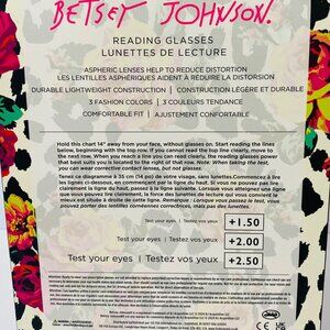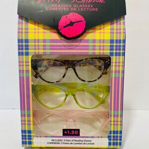 Brand new BETSEY JOHNSON 3-pack reading glasses in strength +1.50. This set includes three stylish cat-eye frames in tortoise, lime green, and blush pink. Lightweight construction with aspheric lenses designed to reduce distortion.