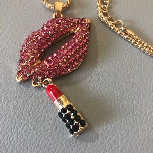 Betsey Johnson® knows how to bring a smile to your face! This sparkly pink rhinestone lips and dangling lipstick are true elegance & whimsy down to it's core! Pendant on a gold chain 24" long.