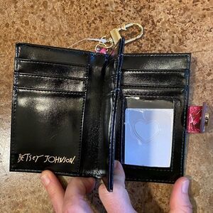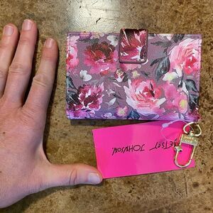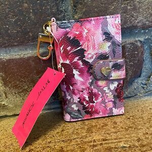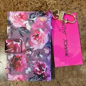 New with tags Betsey Johnson mauve pink floral flap wallet with a magnetic clasp, approximately 6” x 2” x 1”, see pictures for details.