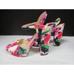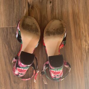 Betsey Johnson Isla 5" heels. Black with red/purple/green floral print, HEART SHAPED BUCKLE on ankle strap, open toe, made of a canvas fabric which is wipeable