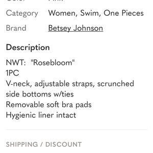 Rosebloom one piece v neck swimsuit with adjustable straps and ruched sides with side ties. Also has removable bra pads and hygienic liner intact.