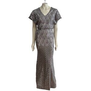 BETSY & ADAM Art Deco V-neck Sequins Formal Dress in Silver Mocha SZ 6