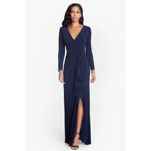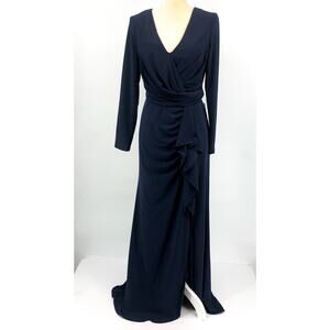 BETSY & ADAM Elle Gown Size 12 Navy Blue Long Sleeve Side Ruffled Slit NWT