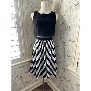 Elevate your style with this stunning Betsy & Adam midi dress, perfect for formal occasions. The dress features a striking black and white chevron pattern on the bottom and a sheer waist, adding a touch of elegance to your look. The sleeveless design and ball gown style make it a versatile option for any event.