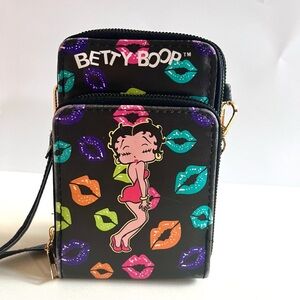 Chic Betty Boop crossbody with colorful lips design. Adds fun to any look.
