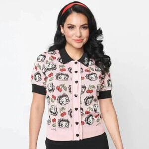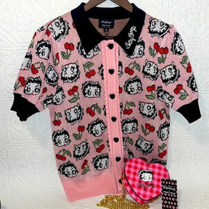 Sweater is M/L - This cheeky 1950s style sweater, in collaboration with Betty Boop, is crafted in a darling pink knit featuring Betty Boop heads and cherries throughout. Outfitted with black on the short sleeve cuffs, hem, and a heart button down. Complete with an embroidered Betty Boop on the collar. Comes with matching Betty Boop heart purse that has a gold chain crossbody strap!