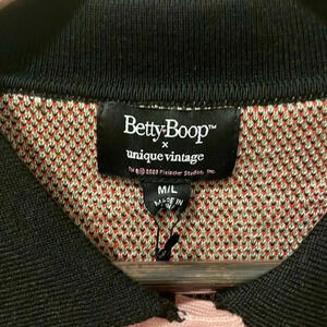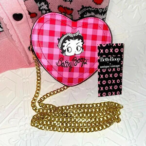 Sweater is M/L - This cheeky 1950s style sweater, in collaboration with Betty Boop, is crafted in a darling pink knit featuring Betty Boop heads and cherries throughout. Outfitted with black on the short sleeve cuffs, hem, and a heart button down. Complete with an embroidered Betty Boop on the collar. Comes with matching Betty Boop heart purse that has a gold chain crossbody strap!