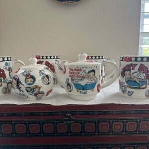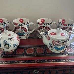 New never used and in perfect condition, Betty Boop Tea/Coffee Set for 4. It includes 4, 8 ounce mugs, creamer/small tea/coffee pot with lid, and sugar bowl with lid..