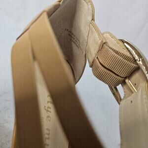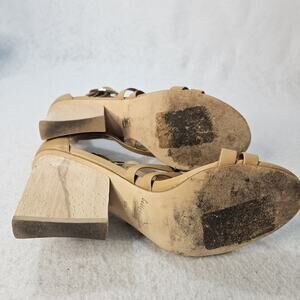 BETTYE MULLER Brown Sz 8 M Tan Leather Wood Heel Sandal Strappy Buckle
